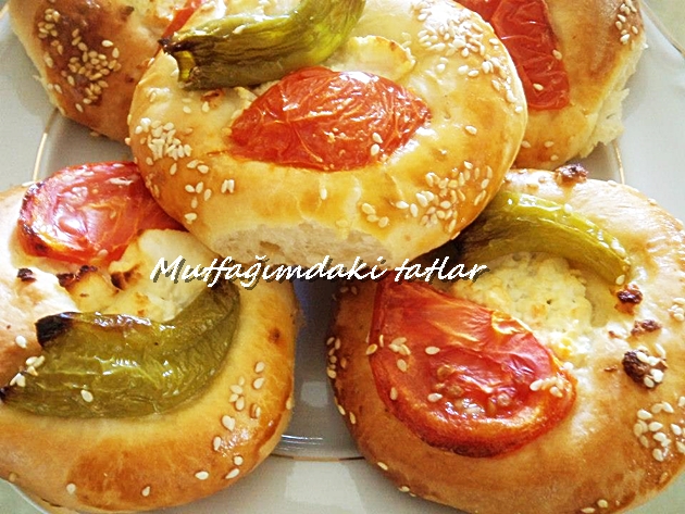 Ortalarına yeteri kadar peynir koyalım. Üzerine domates ve biber dilimleri sıralayalım