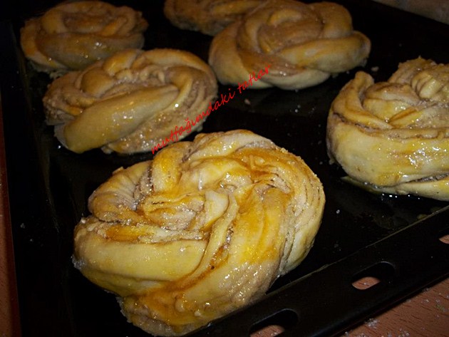 Üzerlerine yumurta sarısı sürüp, hafif şeker serpelim Tepside de 15 dakika daha mayalandıralım ve önceden ısınmış 175 derecelik fırında üzerleri kızarana değin pişirelim